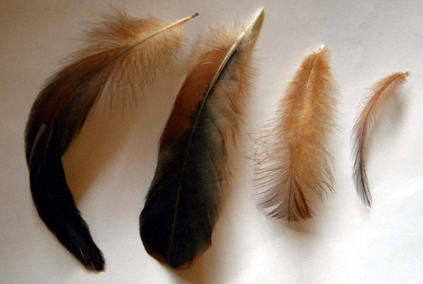 (l to r) Here is a pointed tail feather of a PR RIR rooster. Next, a hen tail feather, which are rounded at edges. Then, a hen saddle (or "cushion") feather is always rounded, with no pointed feathers. Then, a rooster saddle feather is pointed long and thin, usually dropping down at tail sides. The male's hackle feathers resemble the saddle feathers.
