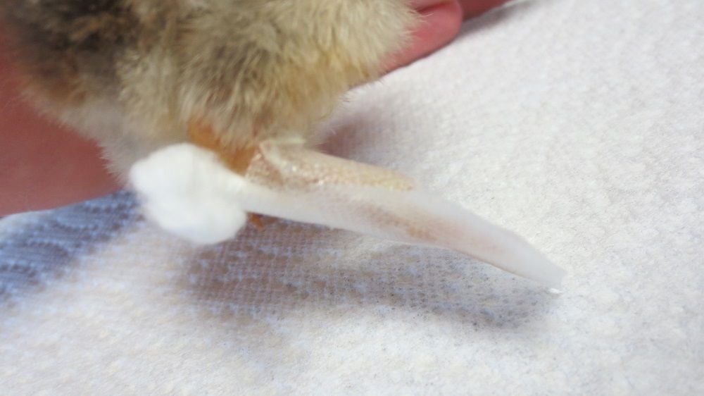 So his foot got cemented in a bad position, and if I can't get it to straighten out, I may have to cull him. I tried searching every keyword I could think of to find out how to save this little guy, and a few things came up that weren't quite like what I have here with him. But I was able to piece together what I read here and there, and I came up with this little Q-tip bootie cast.