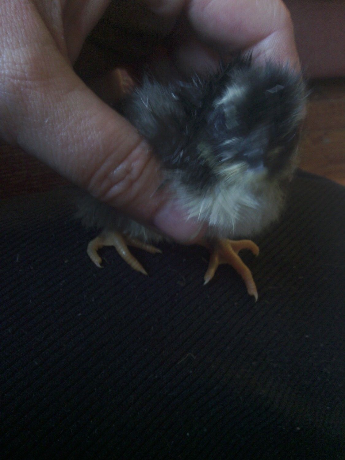 This chick hatched this morning. Her toes are a bit curled. Not anywhere near as badly as a hatchmate, whose toes were completely curled under and to the insides, which made it nearly impossible for her to walk.