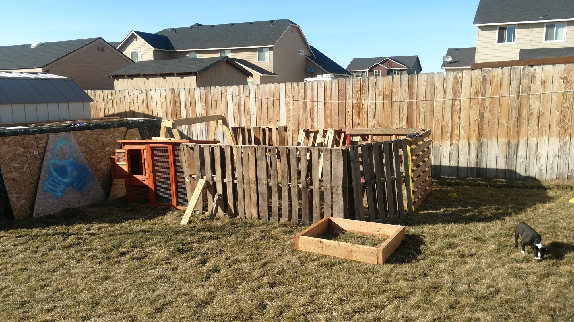 As my husband so lovingly called it, the Redneck Run. Don't mind my stacks of plywood, those are pieces for the coop add-on. I made the wall out of old pallets, one of which will be hinged as a door. Once everything is put together, I'll be painting it, so it looks clean and uniform. =) The little raised bed to the side will be for chicken herbs!