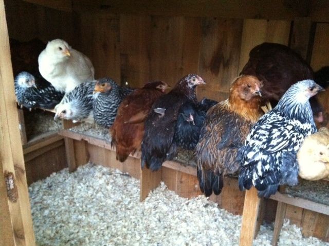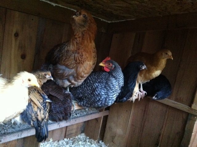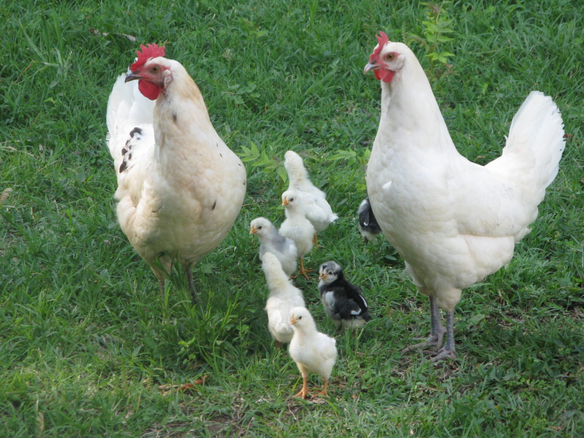 Here are our two Austra-White hens who both went broody at the same time so co-sat on a clutch of 10 eggs. Eight of them went on to hatch. The father is a white-crested black Polish but so far the babies have more of their moms' markings, white with scattered black spots.