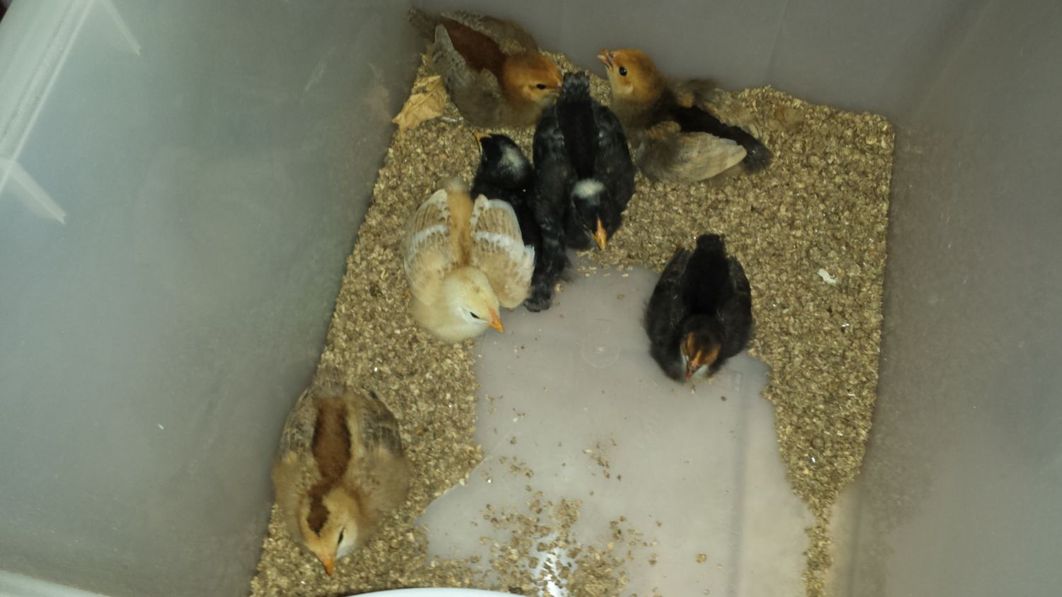We received our chicks today! They are two weeks old tomorrow. Our friends had a couple of broody hens, so they purchased eggs for them to hatch. We are not sure of the breeds, but were told there would be Buff Orpington, Plymouth, Leghorn and Ameraucana. Two of the black ones have a little yellow on the tops of their heads. I think the two lightest brown ones are the Orpingtons, but I'm not sure. They all have names now but we'll see if any of them are cockerels. The tallest black one acts as the protector. We are having so much fun with them. They make quite the ruckus if I'm not in the room talking to them! The smallest black one without yellow on her head is the loudest and never stops chirping! Her name is Gabby. The yellow is Elsa, her sister Anna is one of the browns. The other brown is Penny, the black with the small yellow spot on the head is Omelet and the other black is Maverick. The pretty brown one is Diamond, for the diamond on her head. We would appreciate any assistance in determining the breeds. If not, we will soon find out. I love that their little tail feathers are starting to come in!