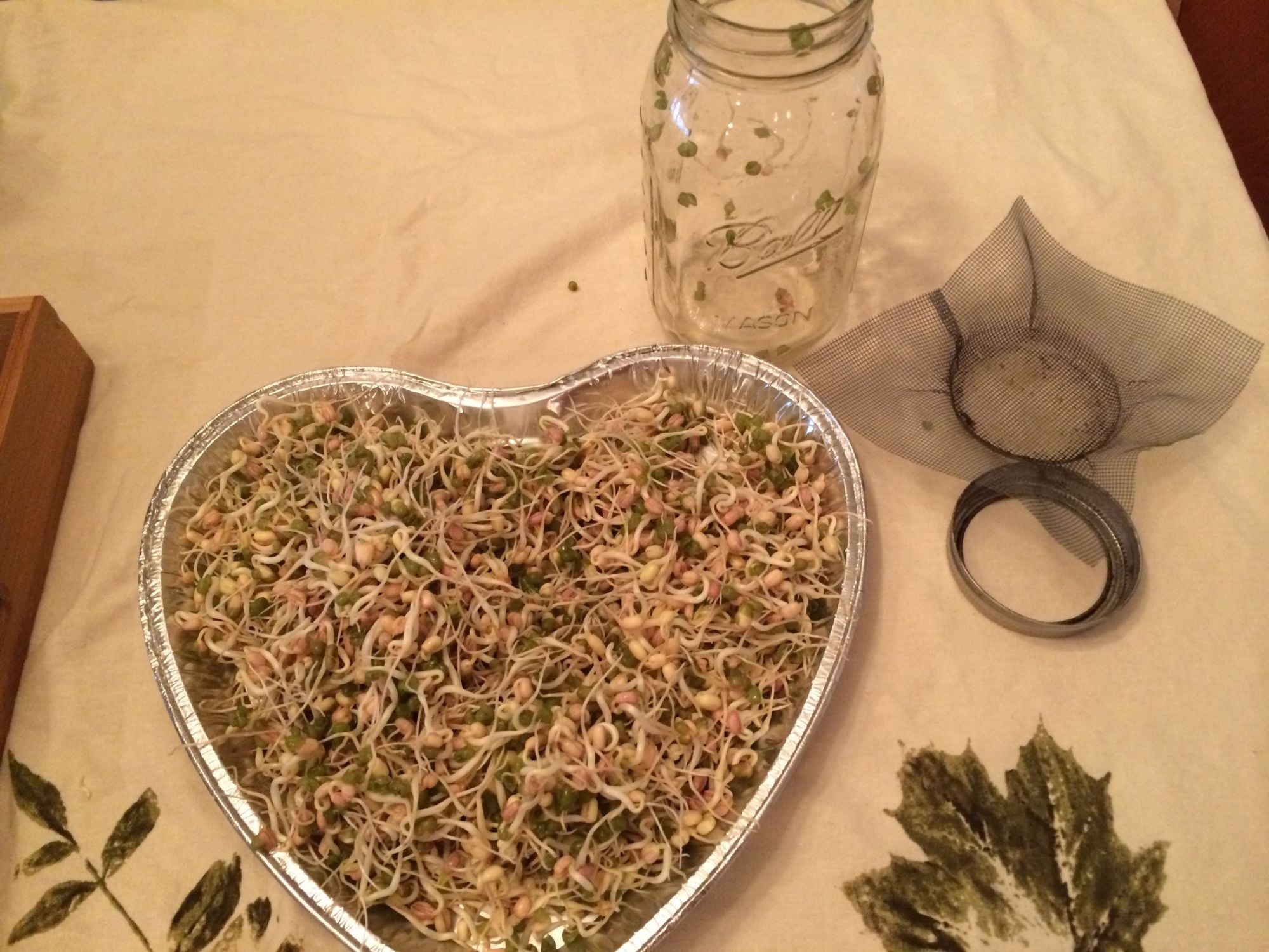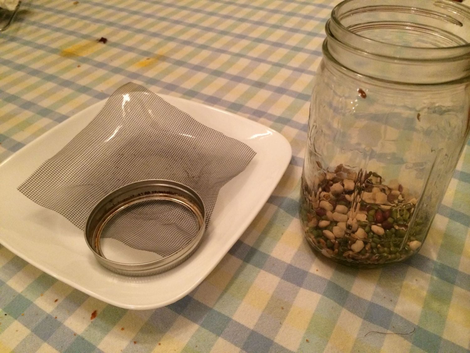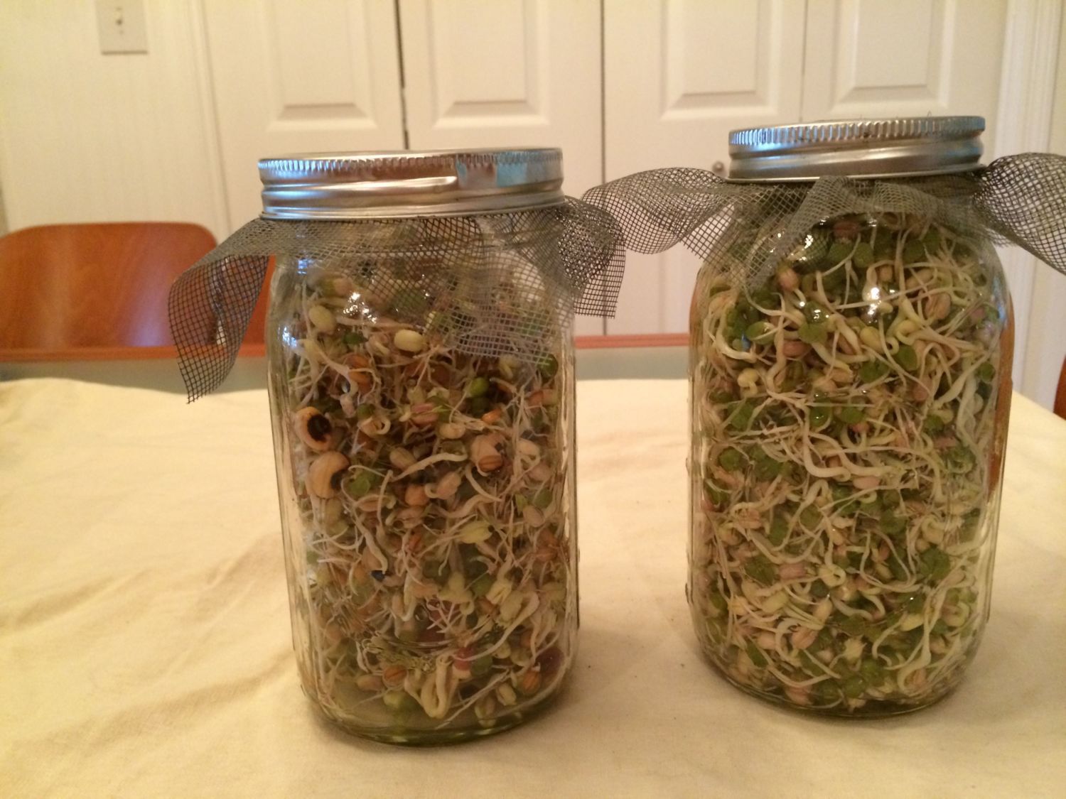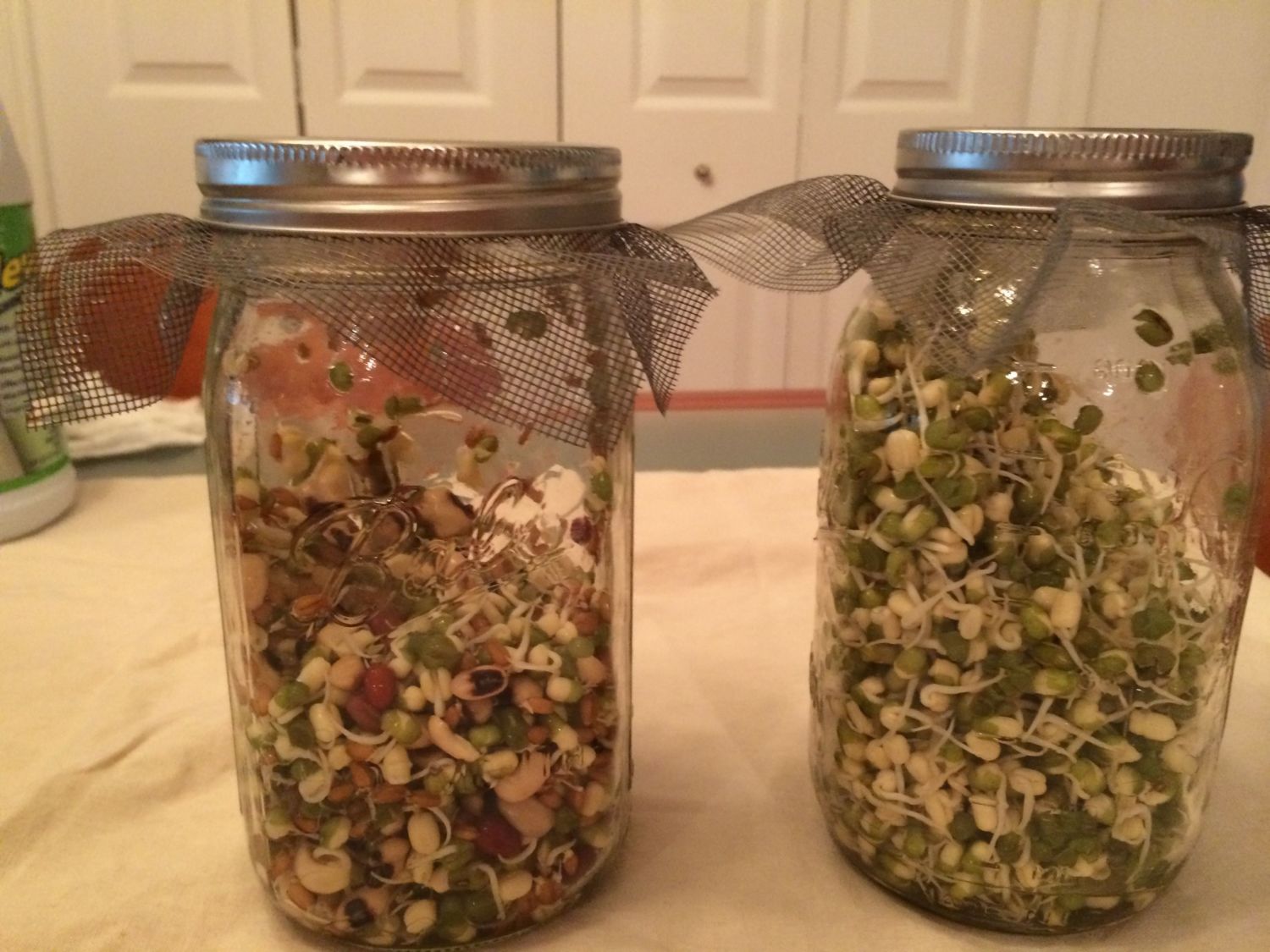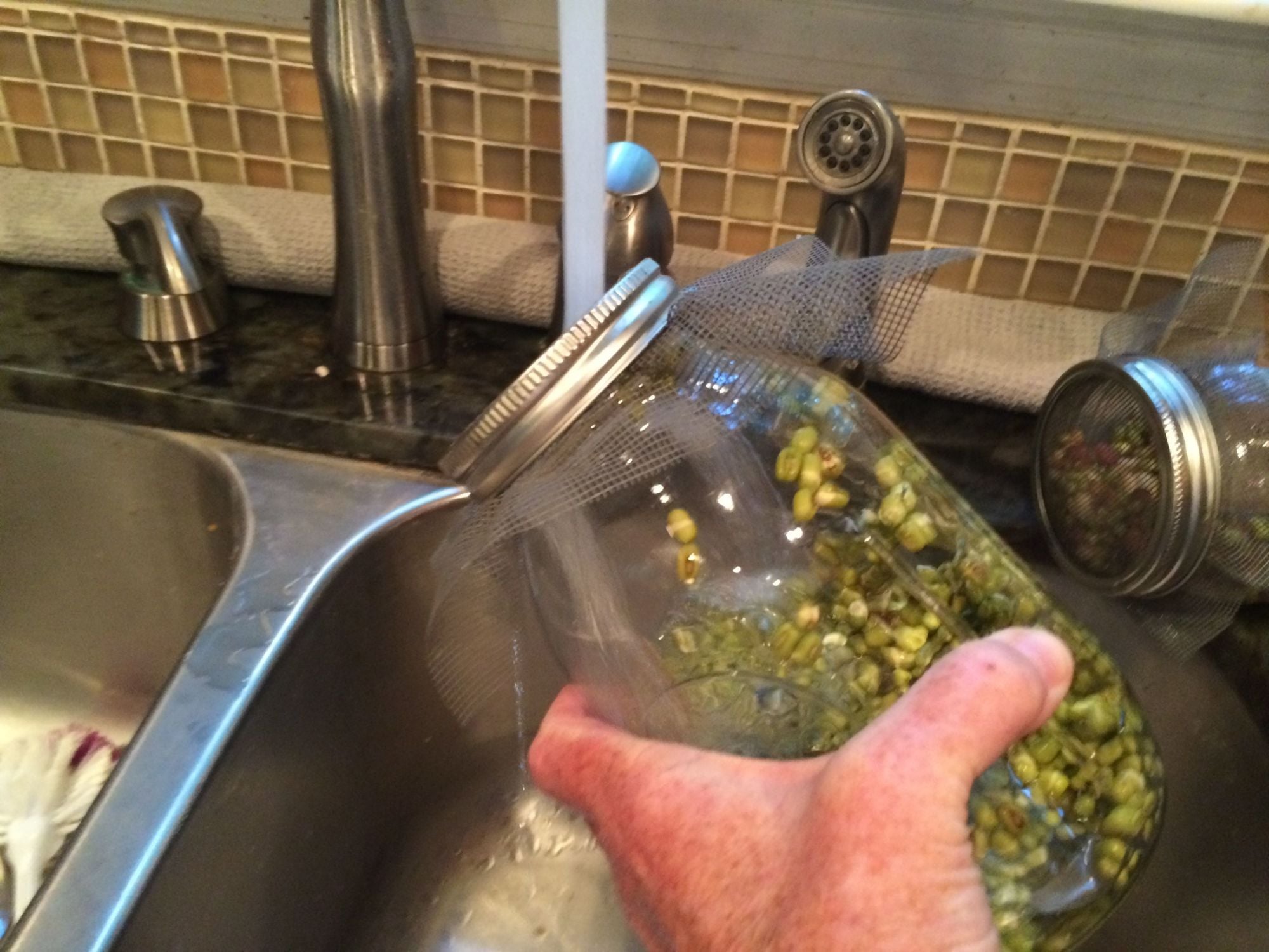 Rinse right through the screen. The jar you see has 1/4 cup mung beans in it. the one on the counter has a 1/4 mix of Adzuki, hard red wheat, mung, black eyed peas and lentils. So day 2 you start rinsing. You may see the seeds swelling and even sprouting now. I leave my jars by the sink and rinse 2-3 times a day.