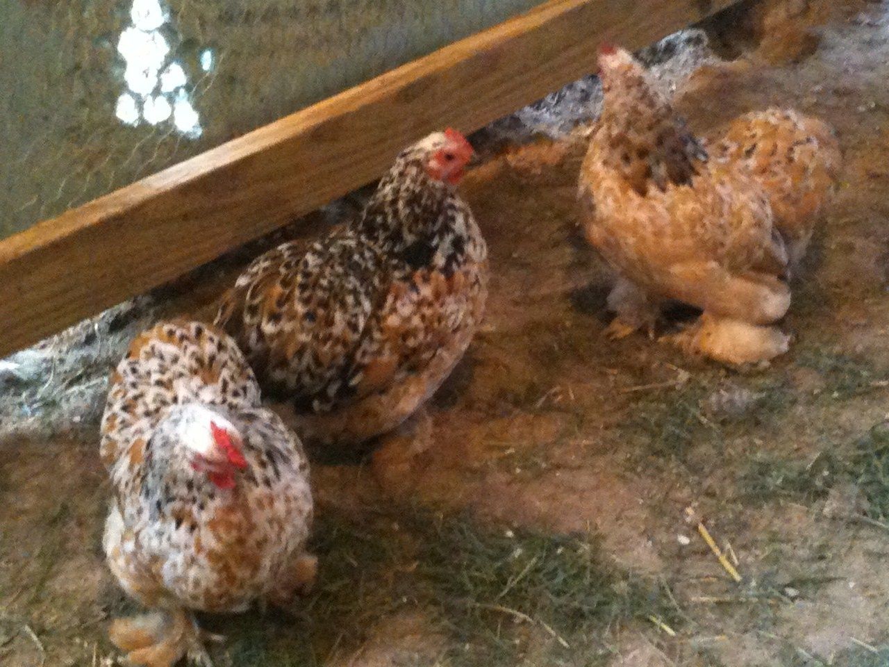 • mystery bantam cochins - mille fleur roo with 2 blue partridge split mille = mille fleur, blue mille fleur, partridge or blue partridge