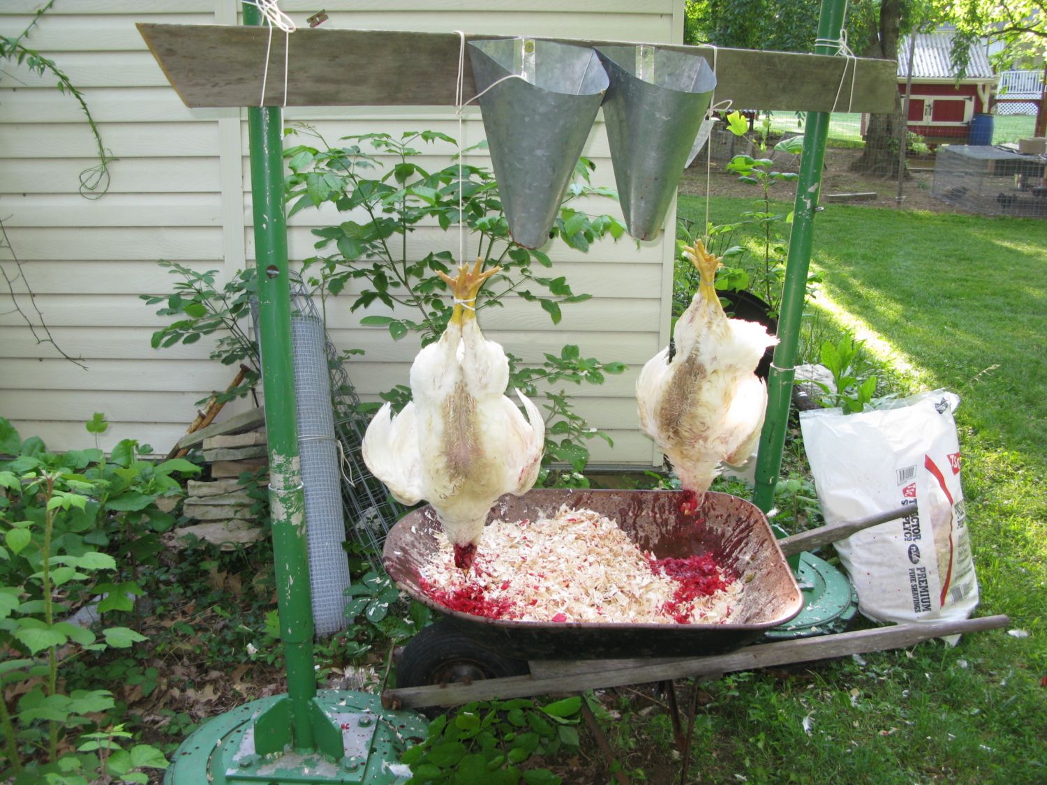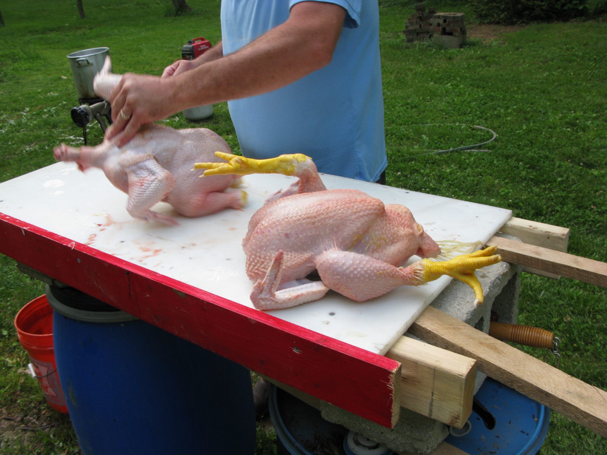 Processed the CX'ers at 3 days shy of 8 weeks. Didn't get live weights, sorry. I was doing two at a time, seemed to work well. After enviscerating I placed them in an ice bath until all 14 were done. Cleaned up and rested. Took birds out of cooler and placed in fridge after rinseing and drying. Then started in on the second half. After they were all in the cooler I took the earlier batch and packed them in shrink bags and took to the freezer. Then did the same to the second batch, although they sat in the fridge ubtil the next night. Then into the shrink bags.