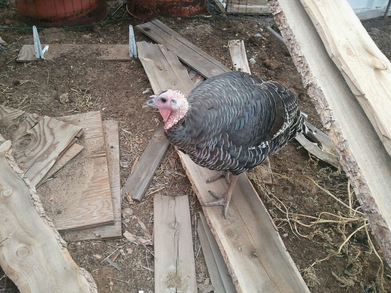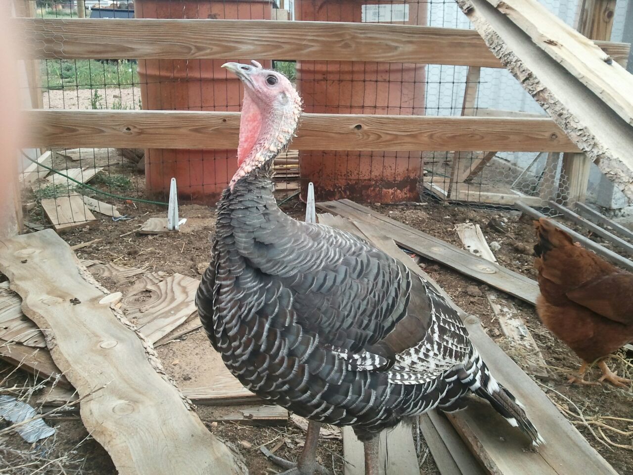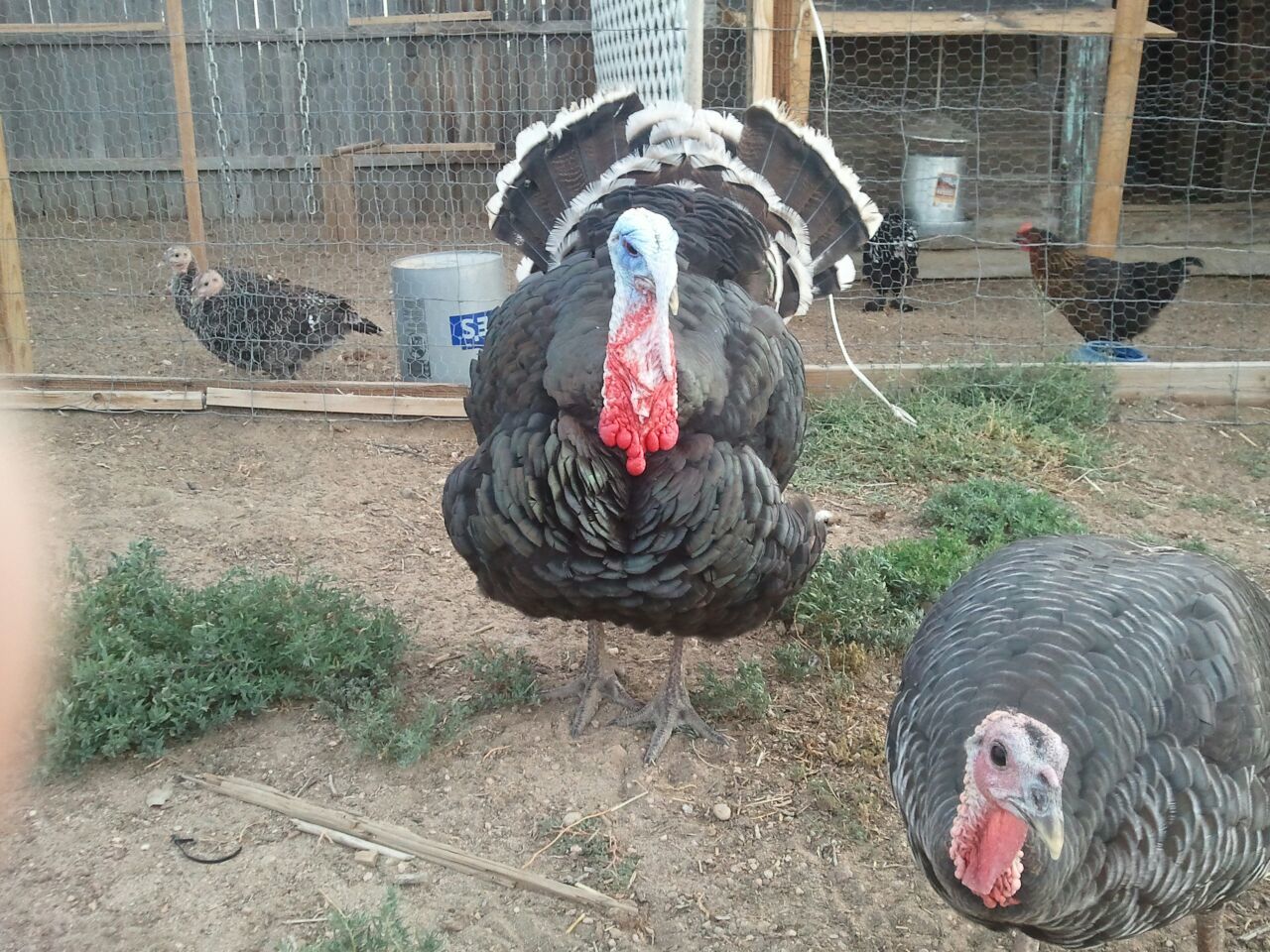 The angle of your photos isn't telling me exactly what I want to see, but look at leg position and their gait. Broad-breasted toms and hens both have legs that are stout and look like they go straight down from the body. Standards have legs that angle towards the center and a more "graceful" appearance. When they walk, BB's waddle like they have a 2x4 wedged between their legs and the standards walk with one foot placed in front of the other. Hope this helps.