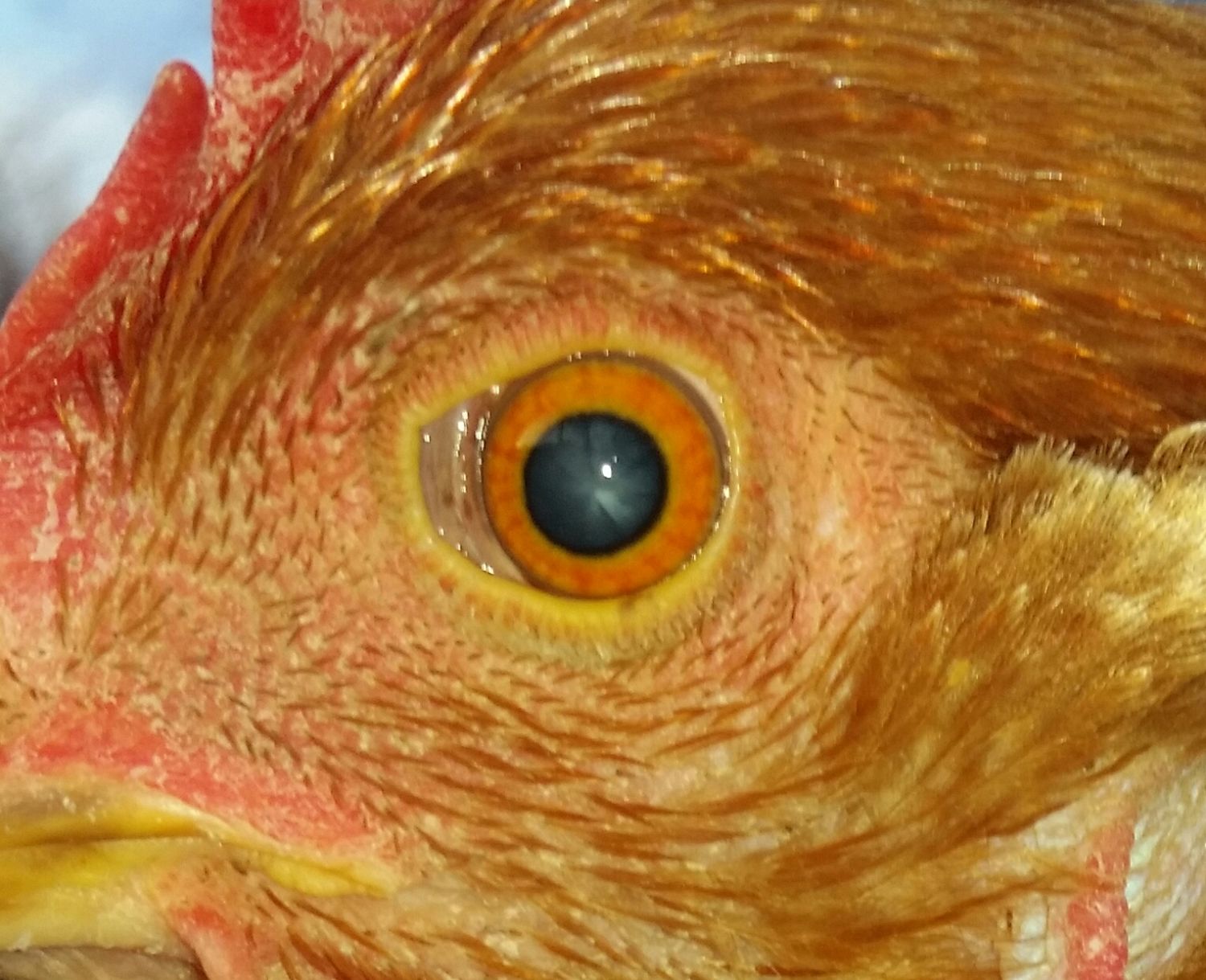 Finally, I just noticed the eye problem a few nights ago. I went out to the coop after dark to check on them, and I notices the eye when my headband flashlight reflected strangely off her eye. The other eye is fine.