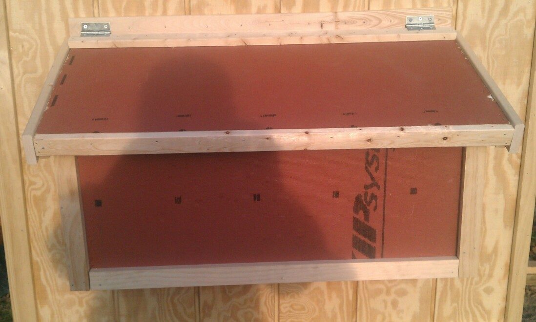 @ Davisfamily....I finished the nesting box and snapped a couple more photos. I used 5/8 inch zip system for the walls, floor and lid. The side walls and center partition dimensions are 16" high (front edge) x 14" high (back edge) x 12" depth. The width of the entire box is 32", allowing about 15" for the two nesting boxes when you account for the width of the 5/8" partition and side walls. For support, i framed the inside of the box(es) with 1 x 2 pine. At the front of the set up (attaching to the coop) I attached a 1 x 3 frame, creating a lip to keep bedding and eggs from falling out. This also served as a means of attaching the setup to the coop. Then, as you cansee inthe photos, I went around the outside of the box with 1x2s as molding....to seal things up. I was planning on shingling the roof of the box, but I'm thinking it'll get too hot in the nesting box.