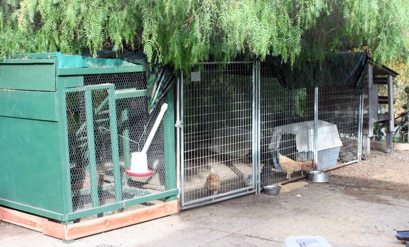 I then built the larger green coop while raising up a handful of hatchery chicks. I designed it myself, and put in a tube to pour the feed in, and one on the other side for the water, as well as a latched full length door on the back to gather eggs. I thought it was best to put the nests up by the roosting area so the sitting hens would feel save, well, that was dumb... They lay and sit, sure, but the other chickens also poop in the boxes while they roost! And apparently I didn't attach the wire floor well; they kept breaking it by jumping down from the roost (didn't feel like using the ladder I made half the time), which meant it was a cycle of escapees and repair (patch wire, or lacing it back) and exasperation at the good part of the yard and porches covered in chicken poop. Eventually they were mostly just free-range (the offending dog had moved) and used the coop at night or for laying, though every couple of months I'd be fed up with the poop enough that I'd fix it again, which usually lasted about a week.