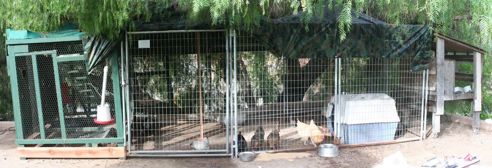 Well, that was more than I had intended to type, lol! But here it is - an angled shot (to get it all in the frame), and a panorama shot from the front. I'll note that since then, I've put hay in the boxes up top, plus in the crates on the right (as I found a cracked silkie egg in the dog crate). Eventually the bottom boards will be painted and sealed like the rest of the green coop. I found that I save a ton more on feed when they have to stick their necks through the kennel to get it - they can't toss it about or poop on it, and same with the water! I am now making longer water and food troughs, to be completed within the next few days.