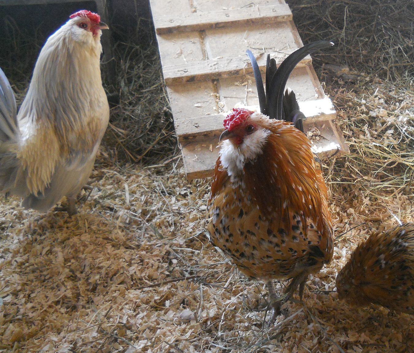 Aubrey and his son, Spike. Spike is Mina's son with Aubrey. Genetics is an interesting subject in this color variety to me. Spike, though visually mille fleur, is 3/4 porcelain, since Mina is 1/2 porcelain herself, and of course, you see Aubrey is pure porcelain. Spike is my little buddy and adores chicks. Aubrey is a good daddy, but has a more D'Anver-like male temperament, as in, "DON'T TOUCH ME!"