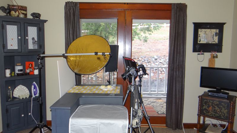 Yesterday I was shooting pictures of eggs for a blog post. I have my room set up pretty nice. The desk works great with the lower area. I bought an ironing pad and I can iron the linens I use for the food shots without going up stairs. Kathy I am using the cute black chicken purse you gave me to hold the cords and gear to keep them off the floor. I only have one cord to plug in now! I attached a small easel to the back of the desk to hold the foam core boards I use for backdrops. That is working really well. I used to use all kinds of things to prop them up and they still fell on the food. In this shot I have my camera on a tripod, a large white reflector, a light box over my speed light, and a Lowell light turned around toward the window. I was shooting early in the morning and this is the dark side of the house. I don't need any additional lighting later in the day!