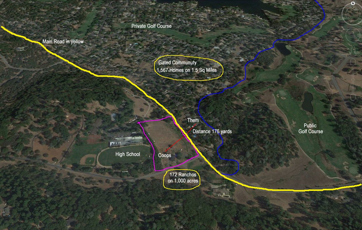 My property has been zoned AG since Nevada County began zoning, sometime after 1851 and all that you can see on the map, was part of it. So all 1,567 people who bought homes in the subdivision knew that agricultural ranch properties were just across the main road. Now they want to say I can't have animals?????? The house with the guy screaming at us is the length of one and a half football fields from my chickens.