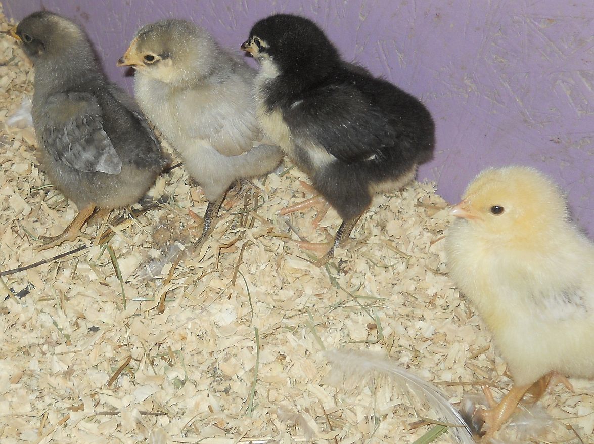 Today's Chickie Chorus Line! The darker blue at the front is out of my avatar, Rex, and my splash Rock hen, Gloria Jean. The black and the very light blue are from Alice and Neela, my blue Rocks and the Dellie looking baby is from my Del x pullet, Raven, with my recently rehomed Del x cockerel, Gabriel. I think I may have a blue barred pullet in the front, considering how quickly that one got a tail and wings. These hatched out Feb. 28. Most are probably not staying, though. Not in the plans.