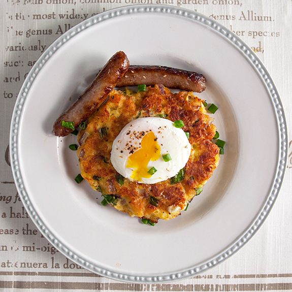 I made patties with leftover bread and cheese for an appetizer last year. I thought it would be a great base for a poached egg. I was right! The patty has torn stale bread, egg, scallions, parsley, and feta and goat cheeses. It is lightly fried then topped with an egg. It was so good even cold after the photo session.