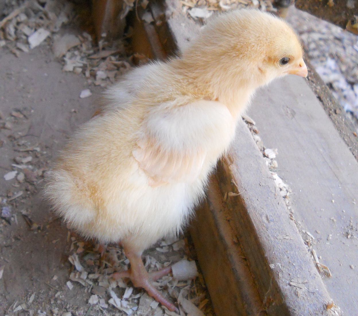 Aimee is doing great with her one porcelain d'Anver chick and her four hatchery chicks, but she's raised probably five batches of babies in her 3 years of life so I expected she'd do fine. I think someone made a boo-boo and sent me a Buff Orp Bubba instead of a Betsy. What do you think? I'm betting the farm on this bobtailed one being a cockerel. They're two weeks old. There are 2 NHs and 2 Buffs, supposedly all sexed pullets. Yeah, right. I already have him up in an ad, I'm so sure, having raised many Orp chicks over the years.