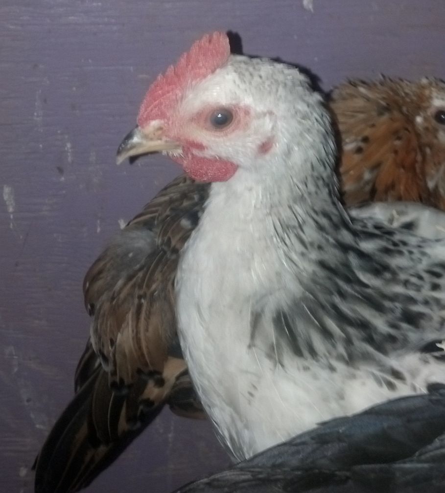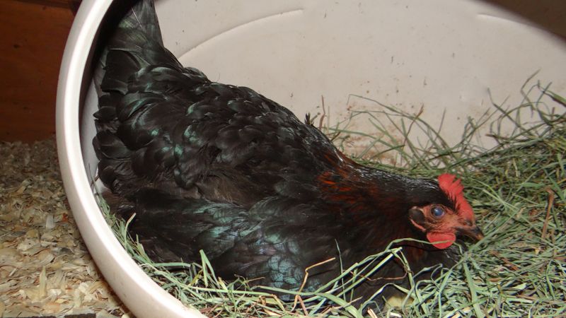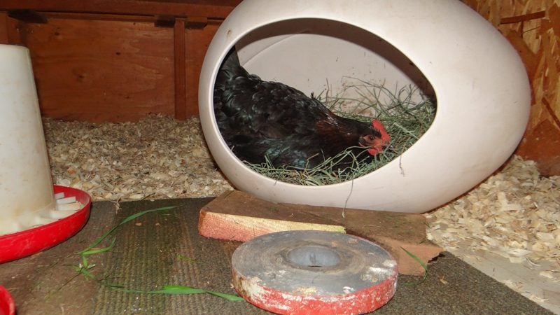 The big switcheroo has begun. I moved her to an empty coop and took the batteries out of the auto pop door so they will be locked in for a few days. I built a little step up into the brooder egg with junk for the babies to get over the lip. You can barely see the little yellow chick under Mama's breast in this pic. Oh, I hope this works!