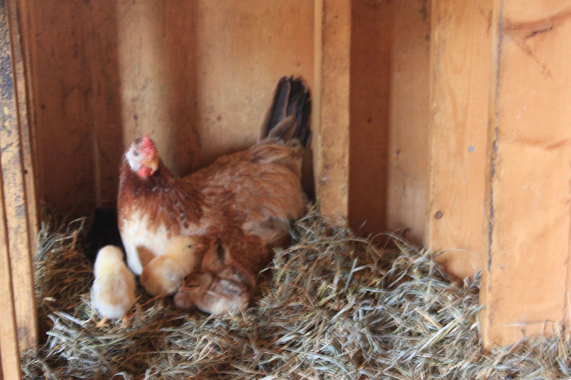 New chicks today! We counted 11 at one point, when I got back outside with the camera she had them back under her in a corner of the doe barn.