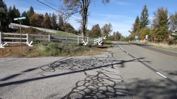 White arrow where each tree was cut down. From the vantage point of people turning at the corner.