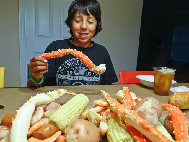 I made Buddy his favorite New England Boiled dinner tonight. You dump the whole mess right onto the table on butcher paper and dig in. I put in king crab legs, andouille sausage, potatoes, corn, onions, cod, and white prawns. All seasoned with Old Bay. Served with cocktail sauce, sourdough bread and clarified butter. Oh my. I made a key lime pie for dessert. I love having a foodie grandson!