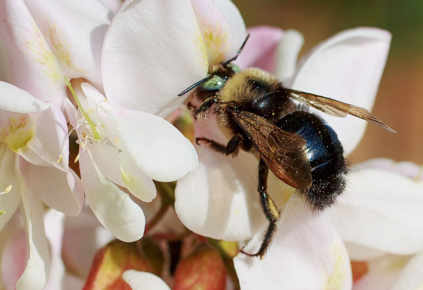 I was curious on what type of bee this is, because it's not a honey bee. It's a carpenter bee.