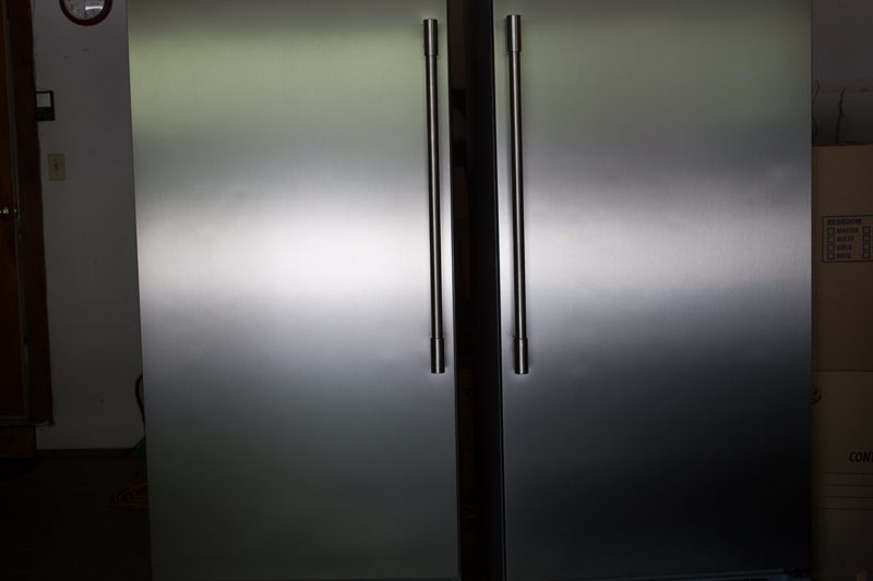 We are returning the large freezer/fridges we bought. We didn't notice when they were delivered, but the fronts are all pitted and dimpled. We only saw it when we opened the garage door. It looks like someone has been hitting golf balls into the doors. Hard to see unless you enlarge the pic. I think under recessed overhead LED lights it will be even more noticeable.