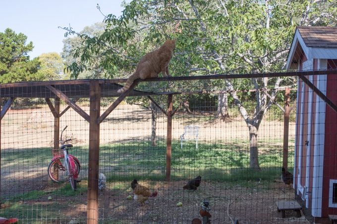 The friendship of Tucker and K.C. may very well have come to a swift end. I went out this morning to check on the chickens and found KC and a black cat that roams the neighborhood sitting on top of the run. I knocked the black cat off with a long piece of rebar but KC wouldn't budge. Then he ran around scratching on the shade cloth until he ripped it. Now my once-taut netting is sagging so low that I can't open the coop door!