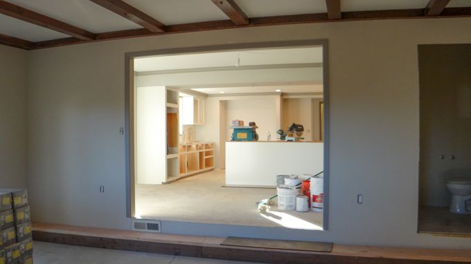 They worked on scraping and touch-up staining of the beams today. Johnny also made a mantle for us to match the beams.They worked on scraping and touch-up staining of the beams today. Johnny also made a mantle for us to match the beams.Dining room