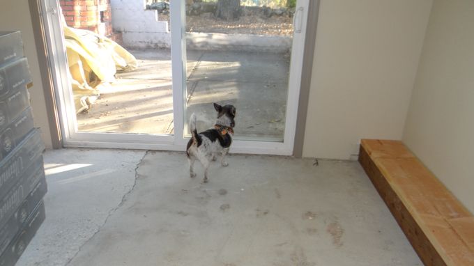 Tucker looking for KC. Note the crack in the concrete floor. It had to be ground down for the laminate. There is another one going the opposite direction, all the way across the room
