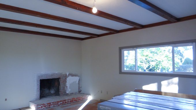 They worked on scraping and touch-up staining of the beams today. Johnny also made a mantle for us to match the beams.