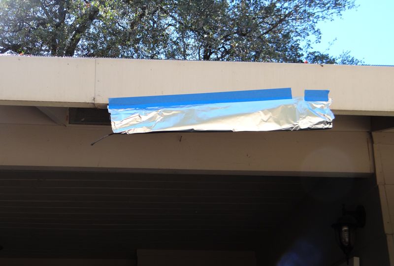 There is a hole in the gutter directly over the walkway to the front door. Eric, my cabinet guy got sick of the rain water dripping on his head so he fixed it very creatively.