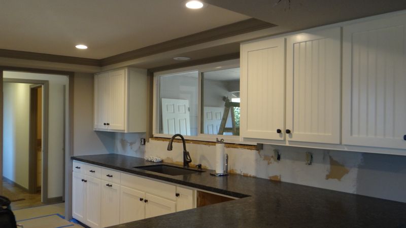 All the cabinets are done except he had to take three drawer fronts off today and take them back to the shop. They need a little shaved off one side to clear the side of the freezer. I will miss those drawers! They'll be back on Monday.