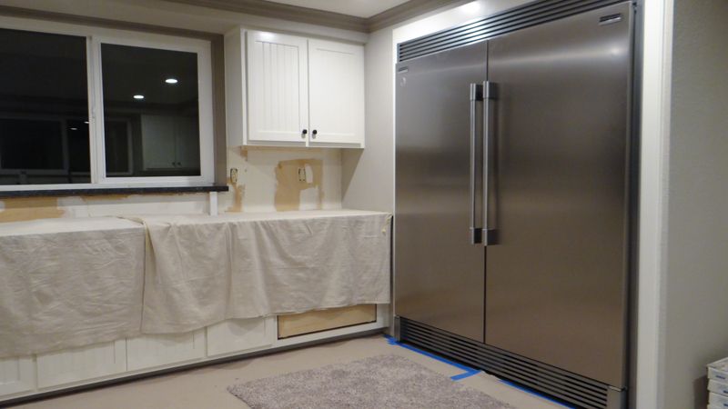 The cabinets are covered in preparation for tile backsplash tomorrow. You can see where the drawer front were removed to cut down for clearance past the freezer.