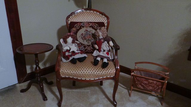 Today I popped in to the consignment shop again and she had added two pieces that worked perfectly for me. I bought a Victorian side table with a leather top. It is so pretty. $38.00! I also bought a lovely sewing basket from the same era. I think they look great in my parlor. Still looking for the "man" chair.
