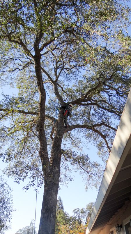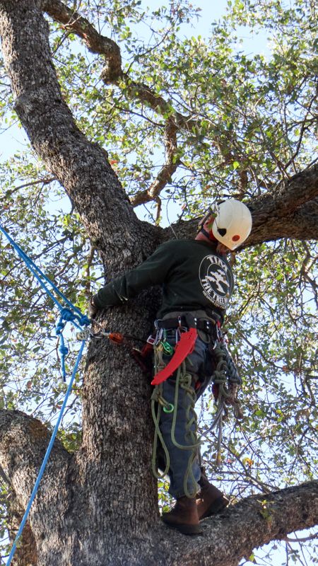 Mike is a professional climber. The other jobs they have done for us have been using a bucket truck. tHis is the first I have seen him climb. Freaked me out to the point I went in and loaded the dishwasher. mIchael and I both have cricks in our necks from watching him. We still have a ton of tree work needed but he took a lot of weight off the tree hanging over the house. The tree that lost a branch is actually in good shape he says. They'll be back with a crew for a full day to get everything done. We surely appreciate what they do for us. We sent them home with pizzas for the familiy. They refuse our money.