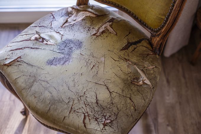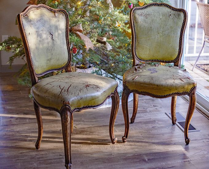 I am reupholstering them in a red French country print with a rooster and a coordinating red checked fabric. Wish me luck. I am going to need it! I am not touching the wood. It has a gorgeous, aged patina.