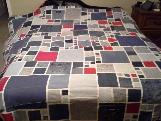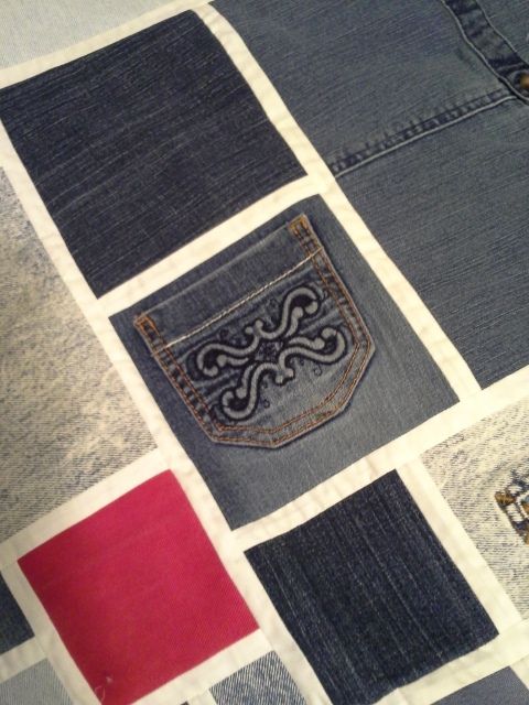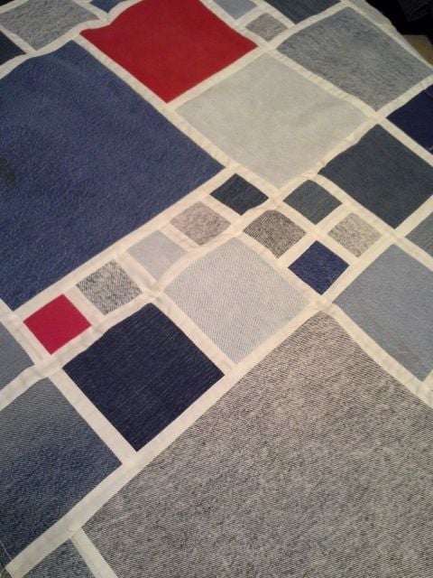 That is awesome! The pockets are so cool. You could put silverware in them for the picnic. I need to learn quilting but I am not sure I could do it with my arthritic hands.Finally got to a milestone on one of those "perpetual projects." I started this quilt top about a year ago, put it away for about 8 months and got it out this week to see what I could do to finish it. Got the top finished! Now it's going to get packed away for another two or three months until summer break is here and I can spend a few days up at my mom's house using her quilting frames. It turned out cute! It's called a stained glass denim quilt. So much easier than traditional denim quilts because you never sew two pieces of the heavy denim together! Going to use a sheet for the backing and not do any batting, it's heavy enough as it is. I made it for picnics, fireworks, etc- outside on the grass stuff. It is queen size.![]()