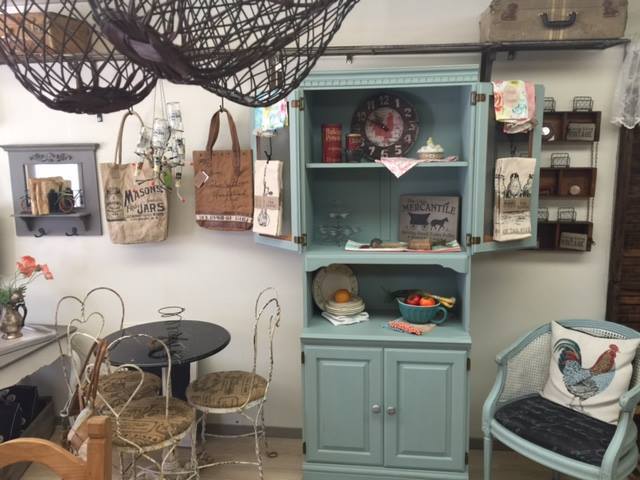 There isn't any room for a shipping department! Too much stuff! But I did open an Etsy shop and I will offer some things that can be shipped. This is the hutch I painted yesterday. With the doors open. The dishtowels and bags came in today. I love them! It was fun opening the whoeslae order. So much cool stuff!I wish I could come see the shop in person. It all looks so interesting.Will you be selling anything online - that needs to be shipped? Probably everything is too big and too much trouble right now. If you do, you will need to add a shipping department!![]()