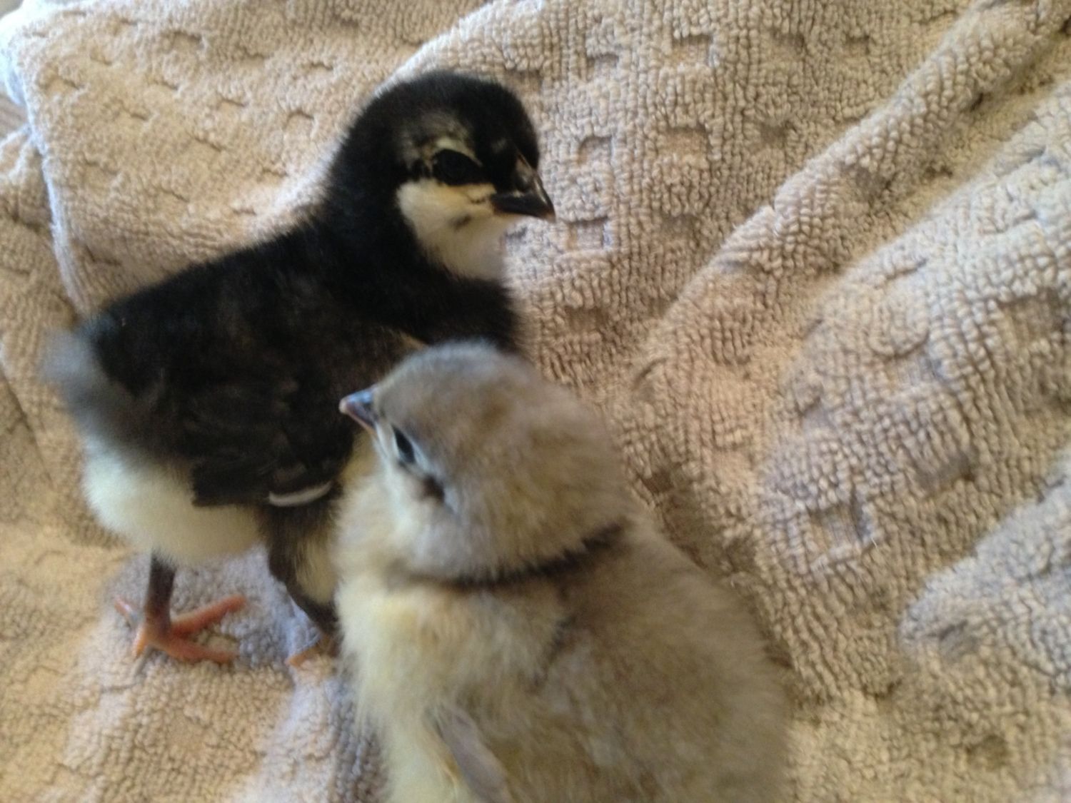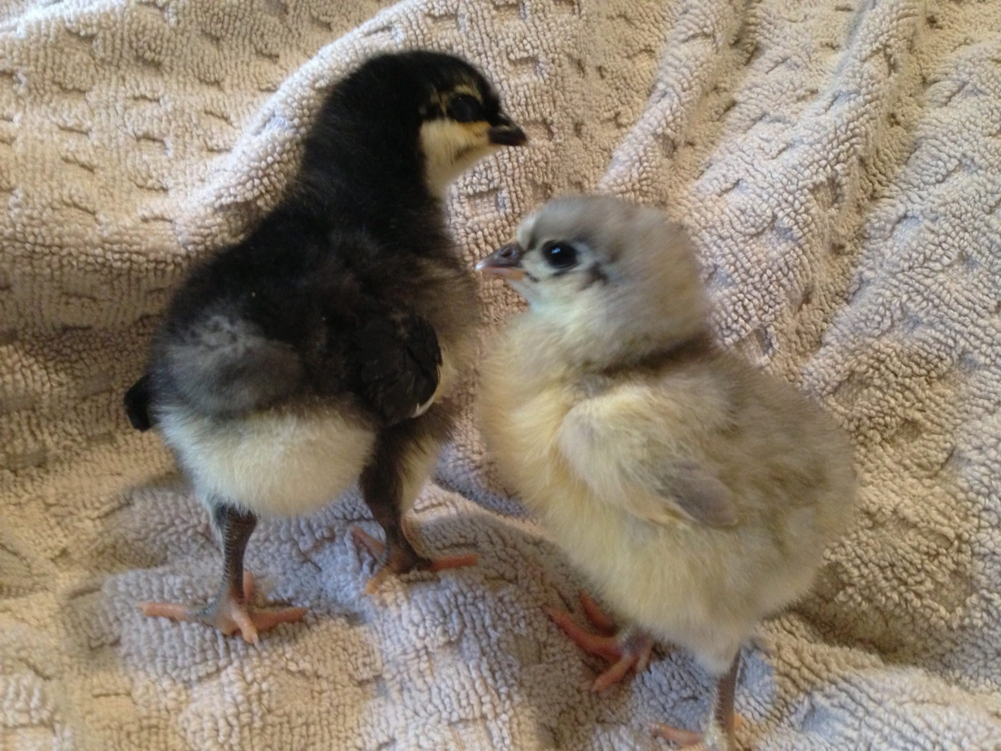 The black one looks like Marans. The other one could be a blue Marans.these look to be the packing peanuts that were included....any ideas what they might be?