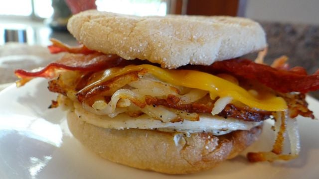 I tried a new take on an Egg McMuffin this morning. Instead of serving an oval of hash browns on the side, I cooked mine in round patties, covered them with cheese, then served them on the sandwich! Oh, and I use regular bacon instead of Canadian bacon. The only negative comment was that the hash browns could have been crispier to which I replied, "Then you should have gotten out of bed sooner and they would have been!"