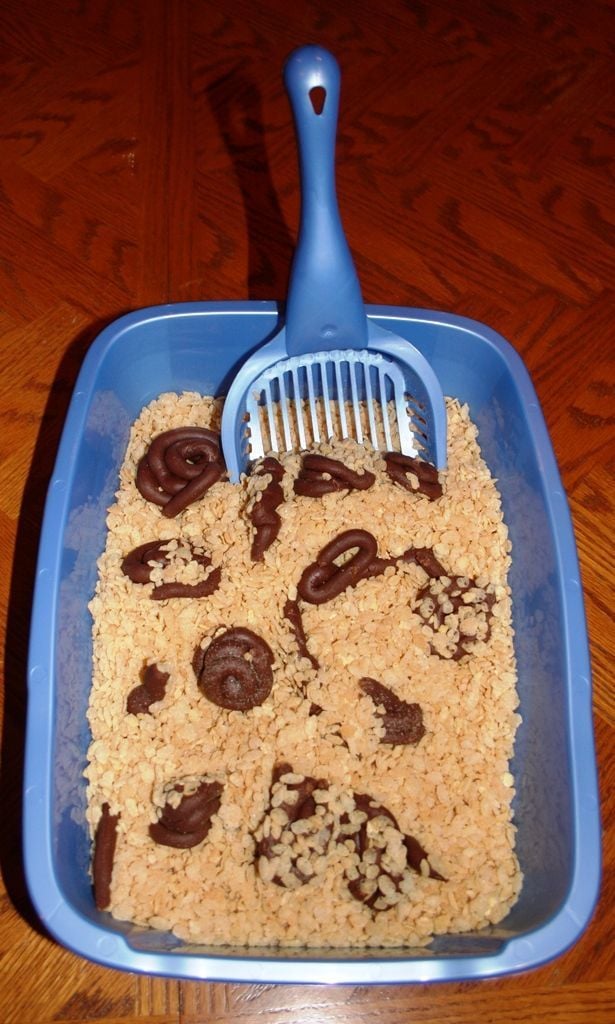 My litter was made with crushed vanilla cookies. You also take about 1/2 cup and shake them in a jar with a drop of green food color, then mix those in so you'll have odor controlling crystals.
