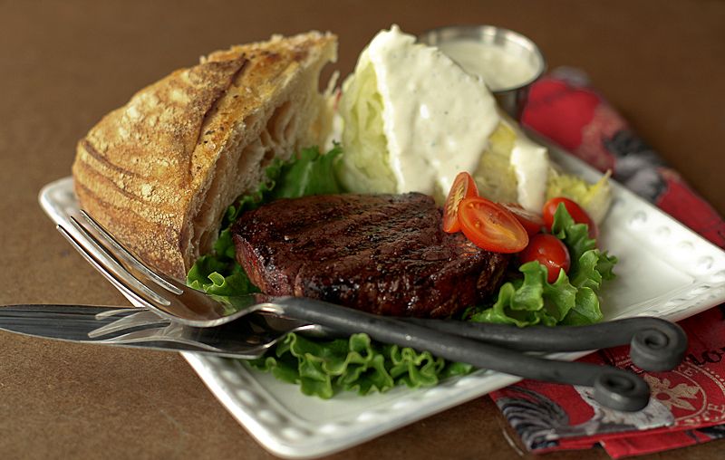Great job with the meat on this one! It looks very fresh and appetizing with great color and sheen. I would use a smaller piece of bread only since it kind of dwarfs everything else on the plate and I would also move the knife and fork so they don't block the main subject. Remember to keep it about the main subject, in this case the meat, and then use the props in a supporting not competing role.
