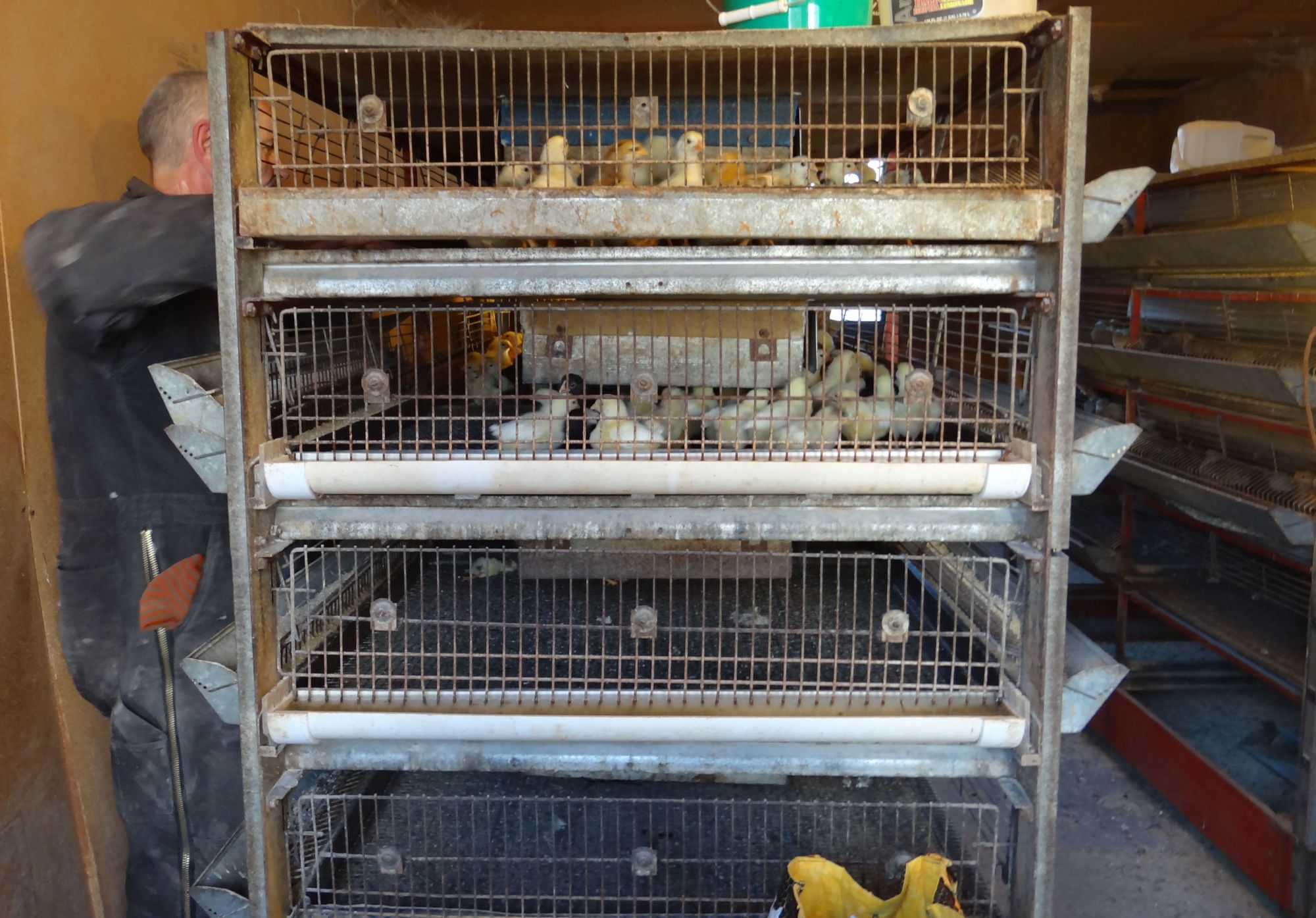 Frank is a super nice guy! Very hard working fella. He has these really cool old brooders that are just great and still work fine, so he uses them. I wish I had some! I like that they are on wire and the feed and water is outside of the cage! He has a gazillion incubators - big big cabinets. I dunno - thousands of eggs at a time is my guess.