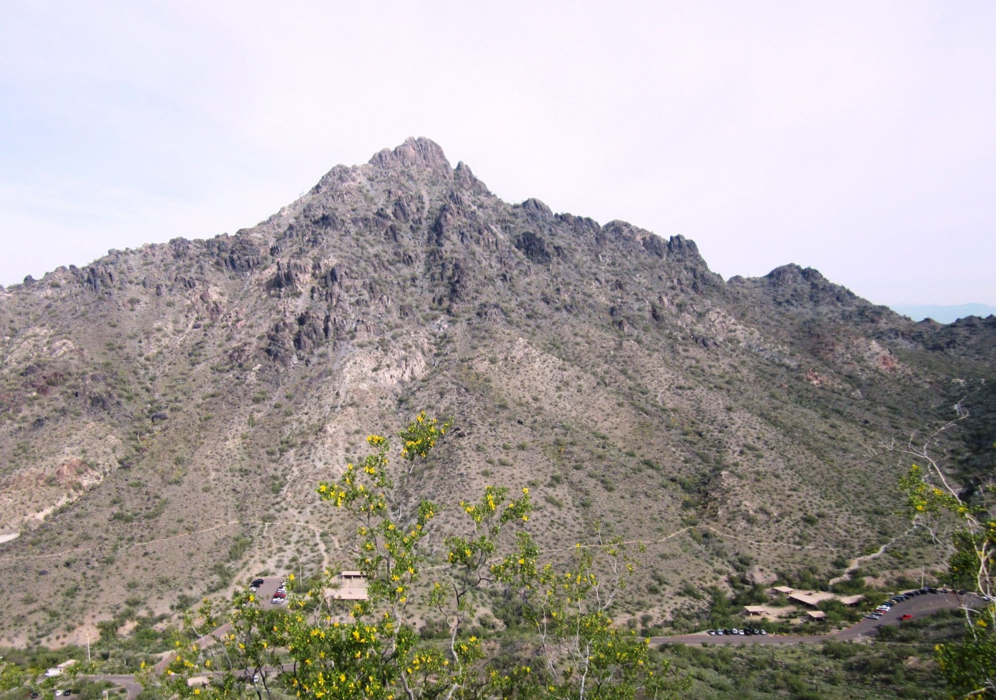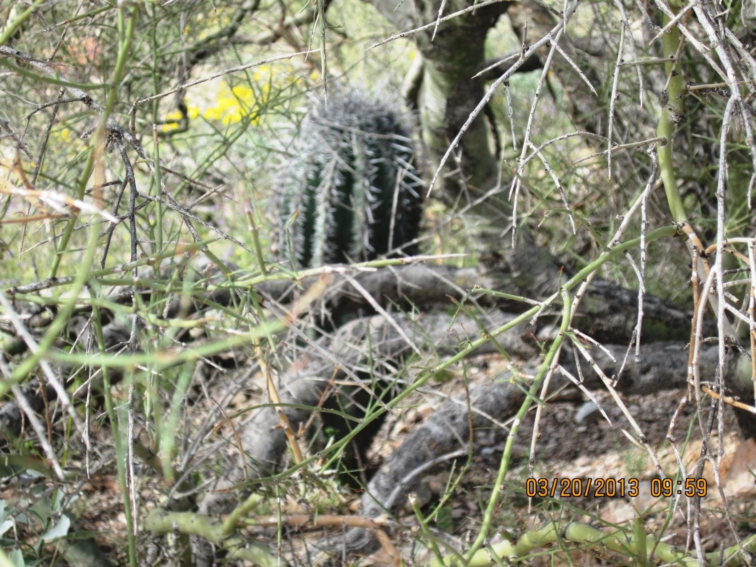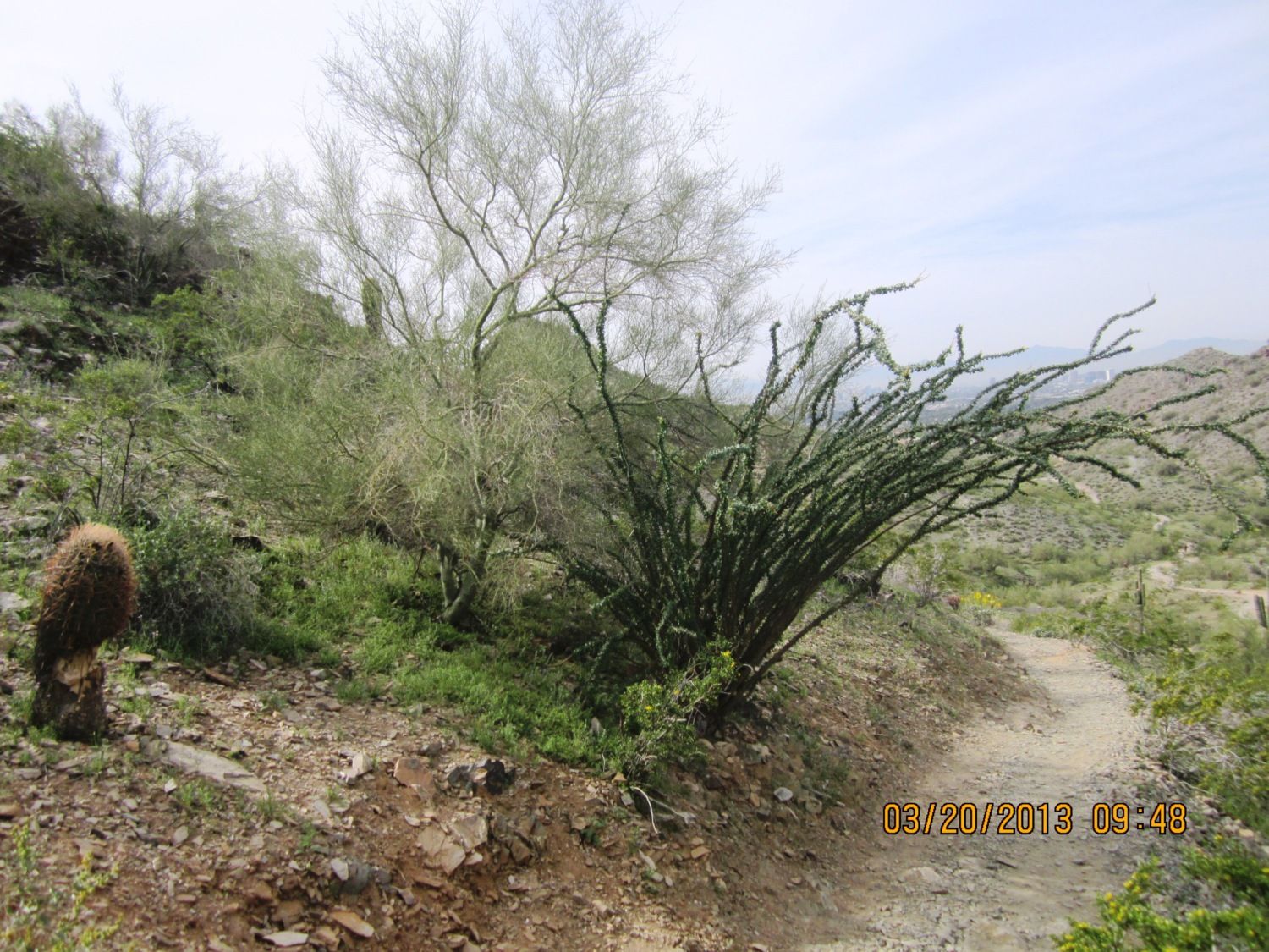 Palo verde tree to the left, Ocotillo to the right. The Ocotillo will be blooming soon with bright red flowers. Both of these trees are known as nurses for baby Saguaros.... They can't grow as young plants unless they are in the shade initially.
