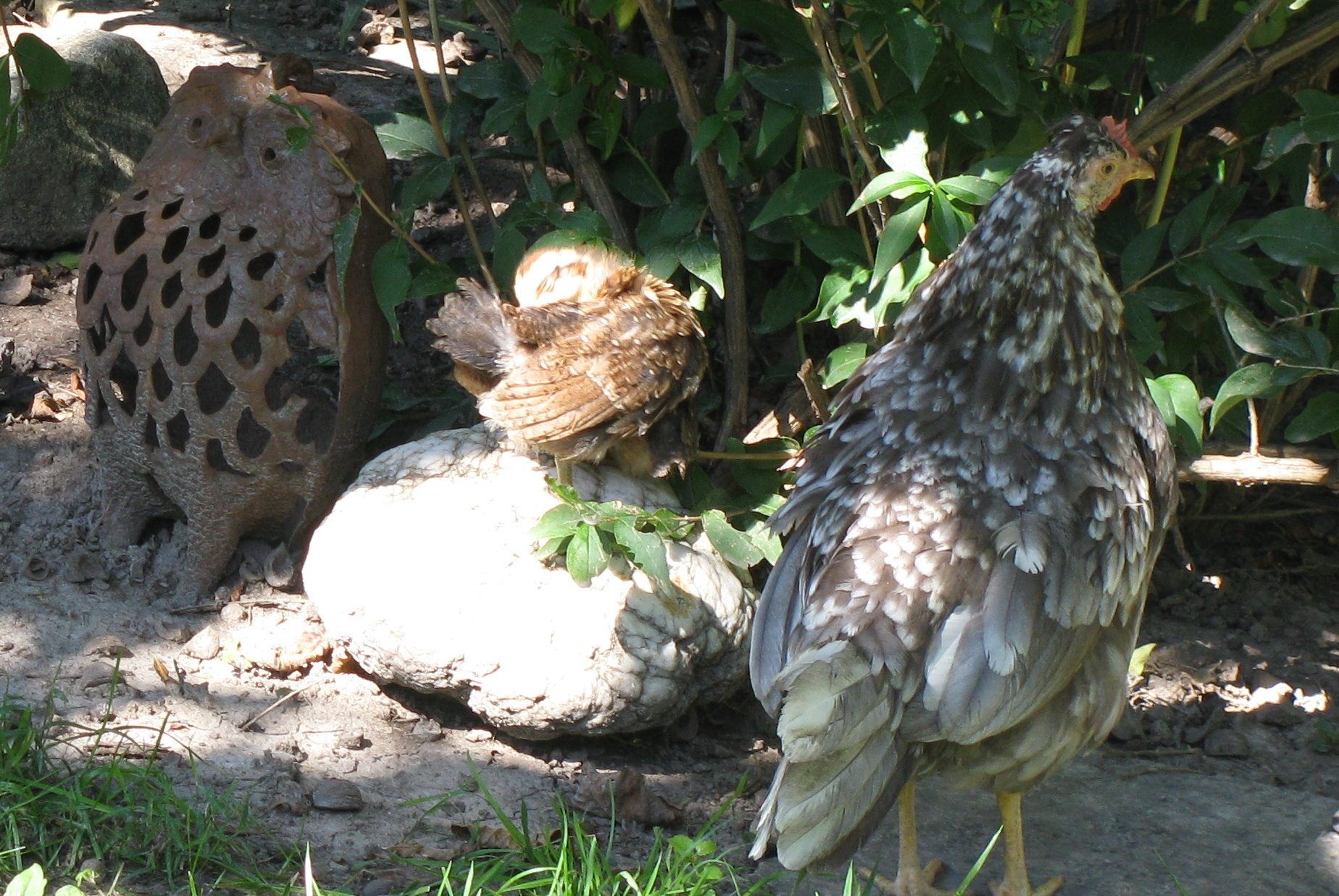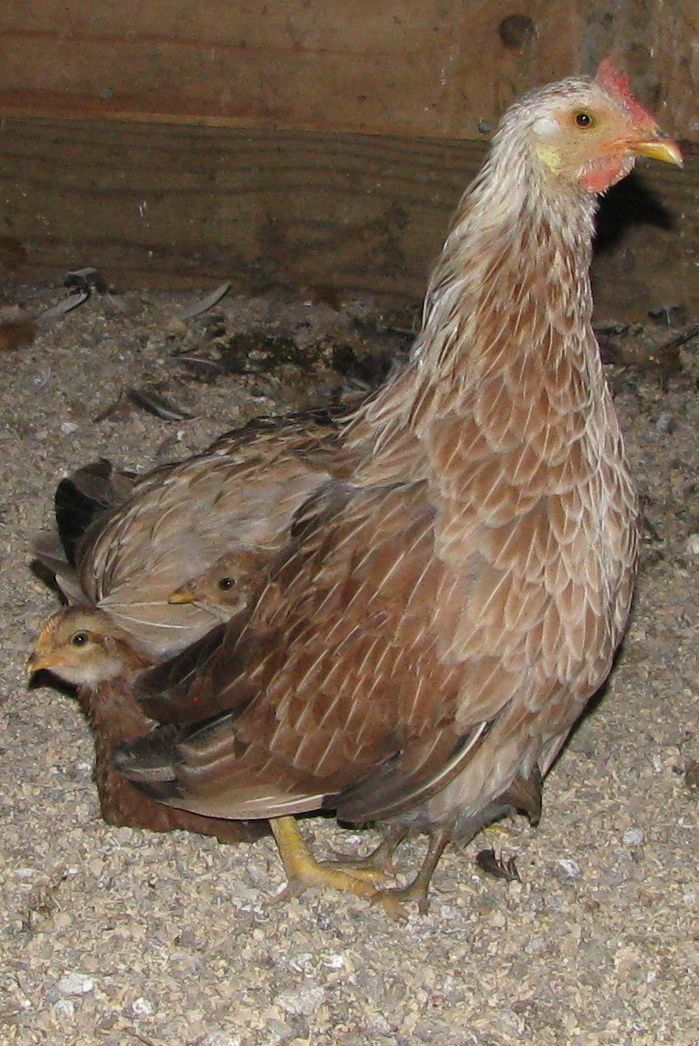 (Icelandic hen Asta with Icelandic chick under wing and Welsummer under bum)