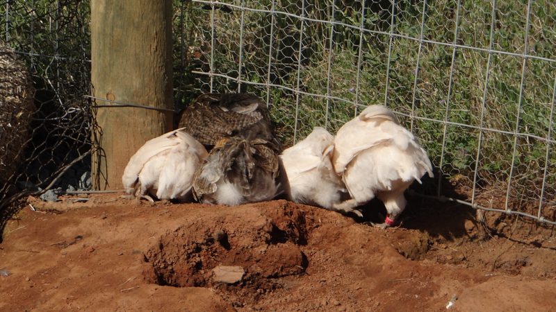 The olive eggers dug their way out of the Icelandic/Layer run where they had been moved a couple of days ago. They are for now in with the old girls because that is the most secure run. Michael brought home 3 more wattles so we can put them up against that back fence and secure it better from the erosion and digging.