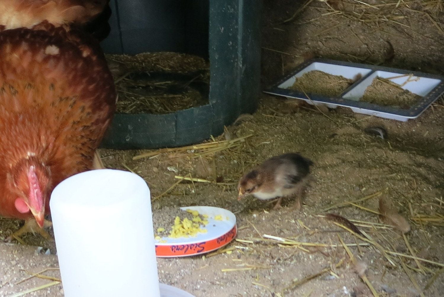 Sister 1 is guarding her duckling, which has apparently imprinted on TWO broody hens: Sister 1 the blue Orp and Little Bit the bantam dark Brahma. They were brooding next to each other and Little Bit still has eggs upon she wishes to set. She doesn't mind the duckling occasionally hiding under her, though. Sister 1 is tahing care of showing it the waterer. I had to move a low feeder close to them, though, as the feeder in that part of the coop is a hanging one.