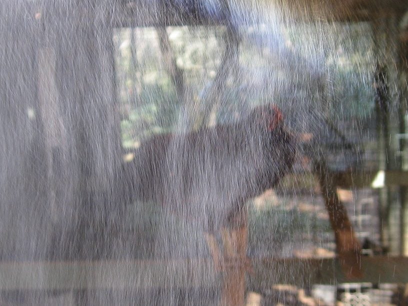 Kevin the Free peacock is in the coop, perched on the top "wall" of the interior Kindergarten Quarters. He made some barking noises earlier, which clued me in to his presence inside the coop.
