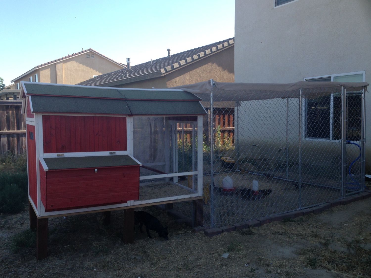 We have now added another dog run and another coop next to it for some older chickens we got and they all seem to be happy. I will find a more recent picture.