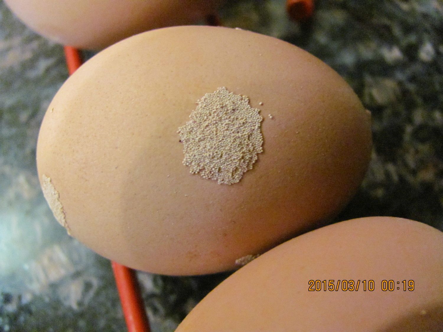 I have one Black Australorp hen who is consistently laying eggs with clusters of tiny calcific nodules on the shell. These look just like the eggs I see on the underside of leaves in my garden where bugs have laid eggs.